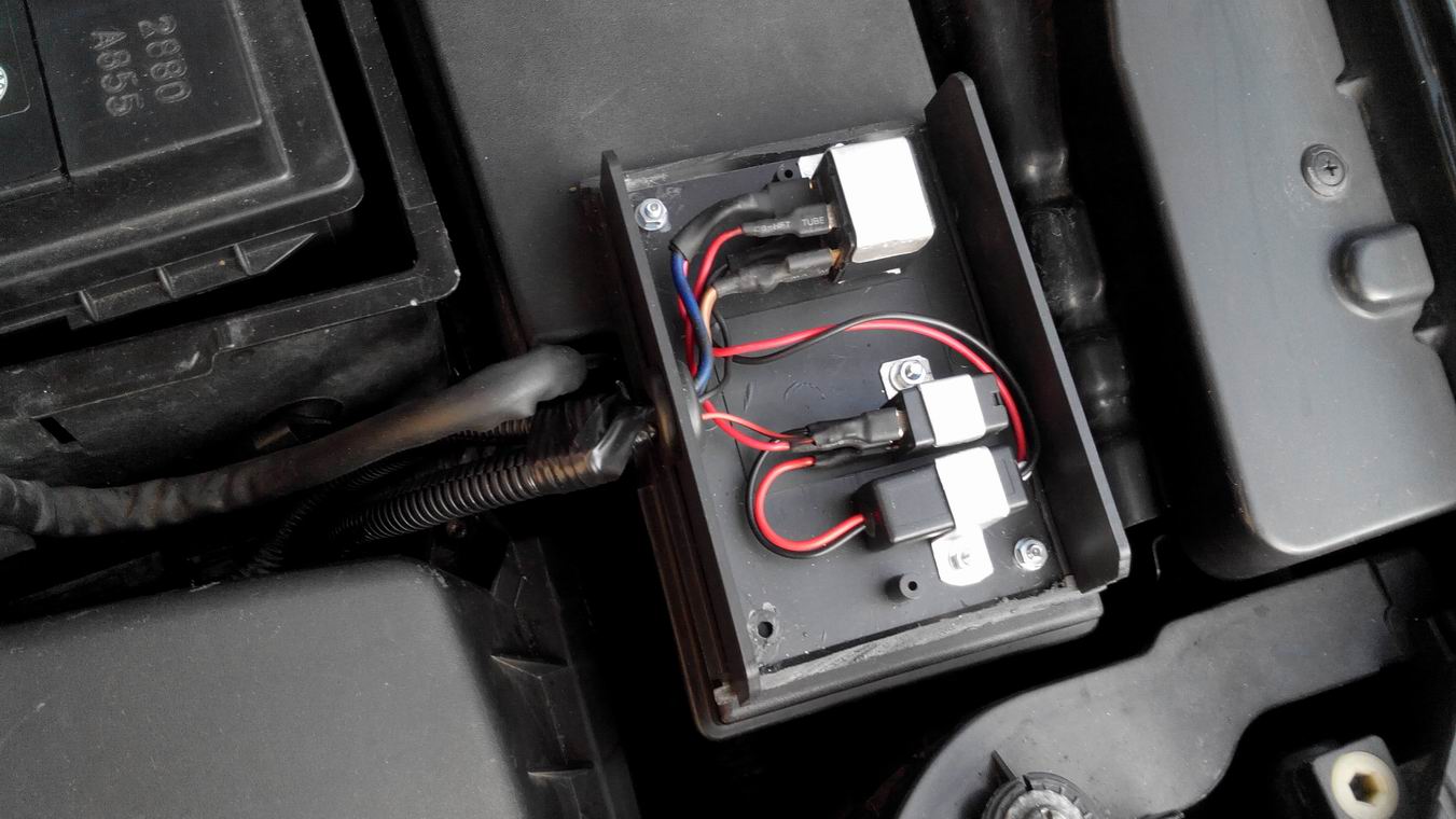 Krabička so spínacím a riadiacim relé a modulom pre denné svietenie /nie je zapojený na svetlá, je využitý len pre spínanie ohrevu/. Použil som ho v obvode kvôli tomu, že zopína až po naštartovaní motora keď sa zvýši napätie nad 13,7V. Nemôže sa tak stať žeby sa spustil ohrev bez nabíjania.