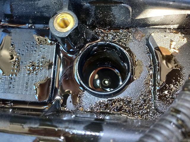 U prvního válce to nebylo až tak dramatické, no ale u čtvrtého jsem se doslova zhrozil. Guma od cívky doslova ležela v oleji, vysušil jsem vnitřek hadrem a když jsem vymontoval svíčku, tak to bylo jako bych jí zrovna vytáhl z oleje, normálně to z ní kapalo.