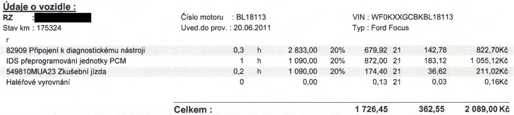 Tak jsem si dnes byl vyzvednout auto zpět z autorizáku. Technik mi sdělil, že mi nahráli tu nejnovější kalibraci PCM, jaká je k dispozici. Byli se s tím i projet (což potvrzuje výpis na faktuře) a prý je to dle nich teď už v pořádku. Když mi technik auto předával, dušoval se, že to "teď jede úplně jinak". Scan vyúčtování přikládám.