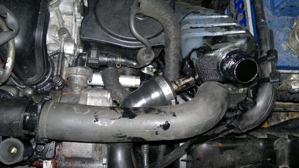 Diky tomu jak je blbe udelane uchyceni hadice z odvetrani do sani, tak mi upadla jedna ta plastova pakna. Nez jsem to lepe zajistil paskama, tak jsem jednou prisel na to, se mi ta hadice z odvetrani odpojila - drzela totiz na jedne pakne. Takze jsem sal nefiltrovany vzduch primo na turbo... Asi jsem mel stesti a turbo jede.