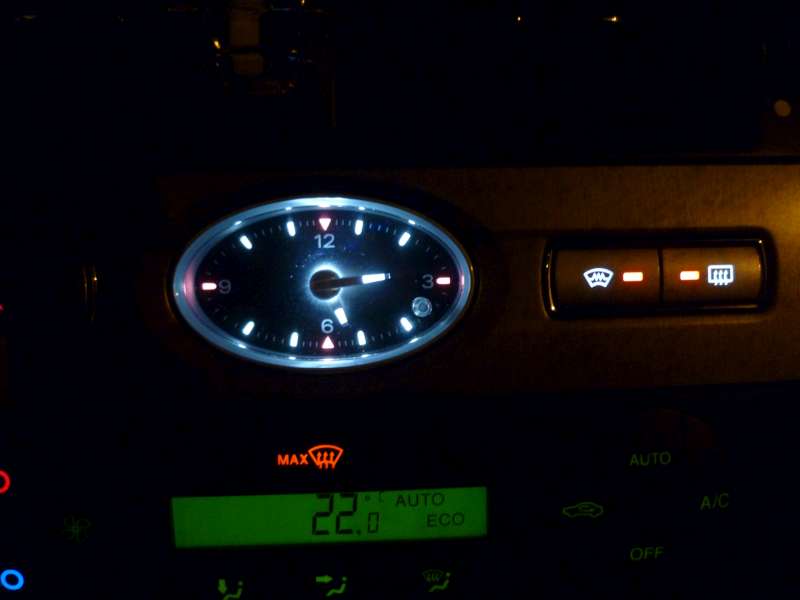 Tak předkládám první fotky, které jsem právě pořídil. Jedná se o hodiny a tlačítka na vyhřívání oken. Na těch fotkách to sice nevypadá tak dobře jako naživo, ale jen pro představu, abych se mohl pochlubit