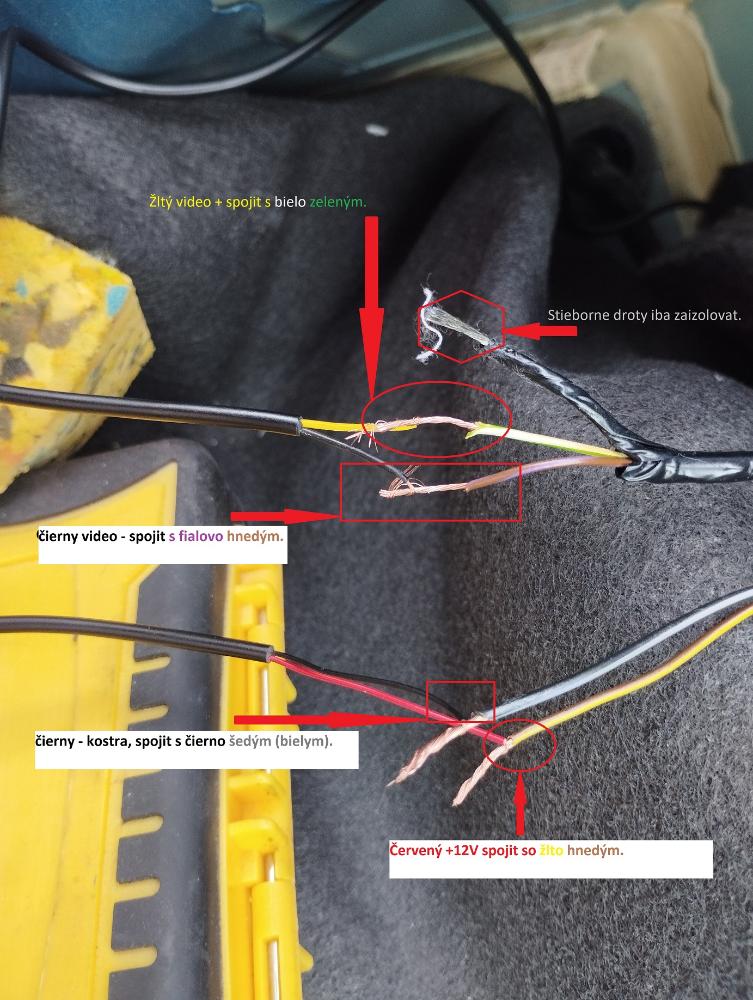 Mam hatchback a tak som zvolil moznost pripojenia cez zeleny konektor, ktory som mal v kufri. Povodne som planoval zapojit priamo na APIM ale na zeleny konektor mi to prislo jednoduchsie a hlavne ak by nieco zlyhalo aby som si neodpalil celu jednotku. Zeleny konektor som odstrihol a spojenie kablov som realizoval zmrstovacimi buzirkami s cinom, kde mi stacili dve velkosti, biele na video kable a cervene 2,4 mm na kable s napetim a kostrou. Schema zapojenia po odstrihnuti zeleneho konektora a po odstrihnuti CINCH video konektora : Na kamere boli dostatocne dlhe kable k cuvaciemu svetlu. Kable ku svetlu som taktiez natvrdo prestrihol asi cca 10 cm od konektoru a spojil s kablami napajania kamery cervenymi buzirkami a este prelepil aj izolacnou paskou. Treba si pre istotu odmerat kde je +12V a kde kostra. V mojom pripade : WiFi transmitter som pripevnil elektrikarskou stahovacou paskou a este prelepil izolackou. WiFi receiver som prilepil obojstrannou paskou na povodny klip so zeleneho konektora a zacvakol na miesto kde bol zeleny konektor. Forscan-om som povolil kameru. A takto vyzera vyhlad z kamery, chybaju parkovacie ciary ale bohuzial Cina, v popise boli ale v realite nie. Vyhlad z kamery spolu so zadnymi senzormi. Prenos obrazu cez WiFi na screen radia je po zaradeni spiatocky minimalne oneskoreny (odhadom cca 0,3 s). Montaz mi trvala cca 5 hod ale minimalne o hodinu menej kvoli neproduktivnemu casu ( cigareta, WC , vahanie ci kable strihat alebo iba odblankovat, vypadnutemu klipu zo zadnej listy a zisteniu ze chyba az po nasadeni atd a pod.) Mne bolo lepsie, ze vdaka pomoci svagra som tom mal jednoduchsie, pretoze obcas som potreboval tri ruky.