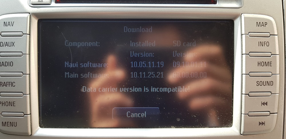 Zdravím pánové, chtěl bych Vás poprosit o radu... Na Ford Kuga se pokouším o aktualizaci softwaru v radiu (kvůli češtině) a nedaří se mi... Stáhnul jsem si všechny možné verze, ale pokaždé rádio píše "Data carrier version is incompatible!" Přikládám foto s aktuální verzí. Mimochodem radio má v tom skrytém kastlíku slot na SD kartu, ne DVD ROMku... Díky za jakoukoliv radu.