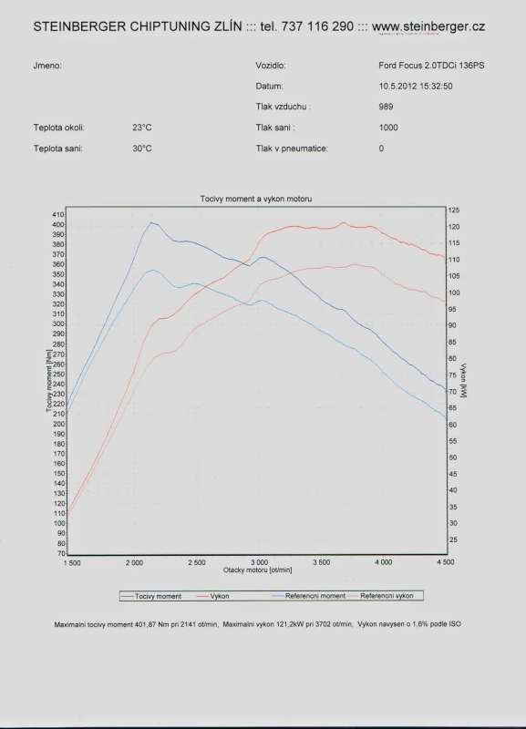 tak jsem se nakonec pro chip rozhodl a to konkretne u firmy http://www.steiberger.cz. Hlavní důvody výběru byla možnost kontroly na jejich brzdě a hlavně upravují data načtené přímo z řídící jednotky (ne nějaký univerzální chip). S borcem jsem si dal schůzku, na té si vyčetl data z ŘJ, provedl několik diganostik motoru a až na základě úspěšné diagnostiky jsme si domluvili termín nahrání a kontroly na brzdě (na dnešek). Dohromady jsme prováděli 4 úpravy dat (4x na brzdě) než jsme dospěli k optimálnímu naladění dle mých požadavků a výsledek je 121kw a 401Nm. kouřivost je mírně zvýšená ale projevuje se pouze při opravdu razatních rozjezdech, při bežné jízdě nikdo nepozná rozdíl