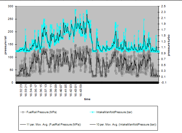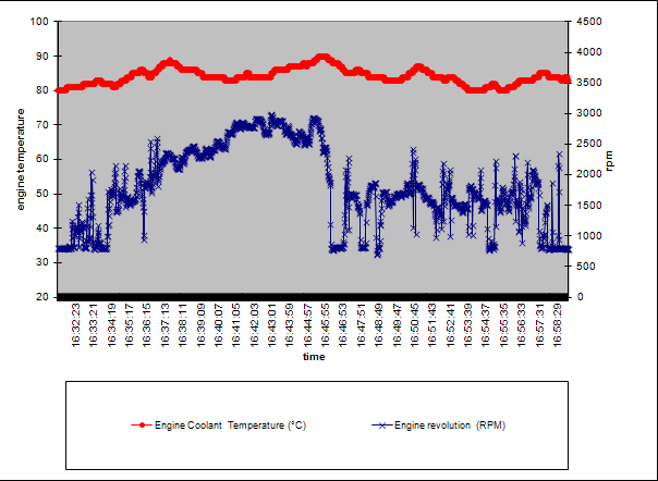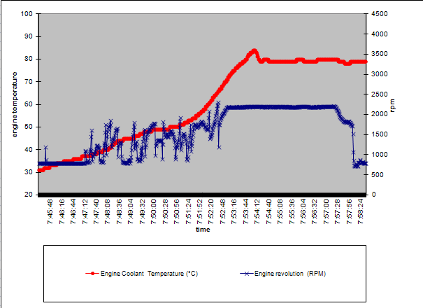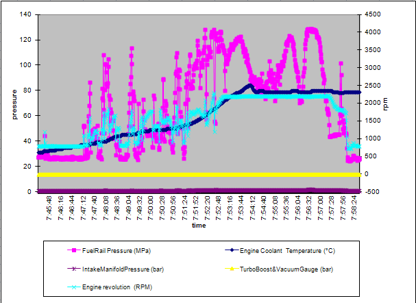 Tak jsem provedl sber a zpracovani dat z ridici jednotky pres ELM327 a Torque. Tady prikladam par grafu ,ktere ukazuji zakladni funkce motoru (teplota,otacky,tlak turba,tlak paliva v zasobniku, podtlak vývěvy). Jeste presne nevim jak do logu dosta i dalsi veci, ale na to casem prijdu.