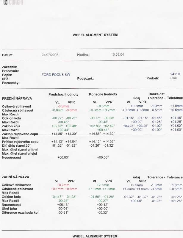 Opakujem : Geometria robená v pri kúpe 24.07.2008- ok a v decembri 08´pre istotu na novučičkej 3D geometrii. Všetko v stredoch - okrem ľavého zadného kolesa/čo som si žiaľ všimol až doma - mechanik povedal že je to ok a nastavil iba pravé predné do stredu zeleného poľa. To ľavé zadné je na 0°16 a pravé zadné 0°08 s tým že tolerancia je u oboch od 0°07-0°16/ľavé a 0°16-0°07 pravé zadné.