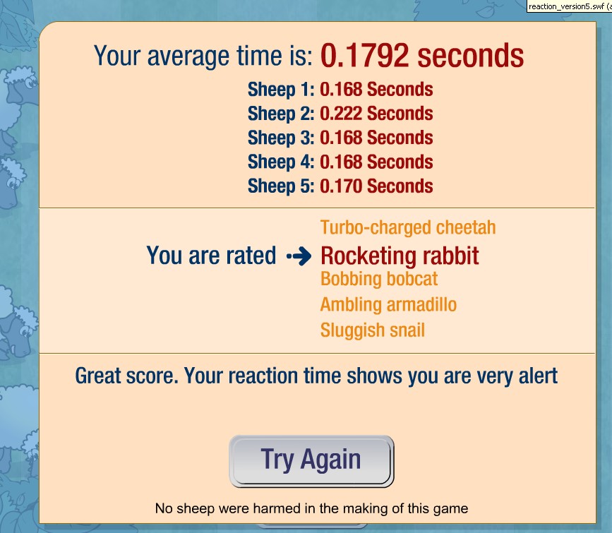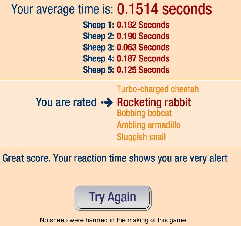 sranda na druhy alebo treti raz 0,168 ale jednu ovcu som trafil 0,0000 este len sa chystala k startu ale pred tym som mal 3sekundovku ale hentu som trafil na chlp... :D :D :D