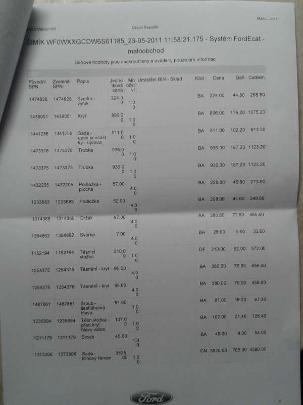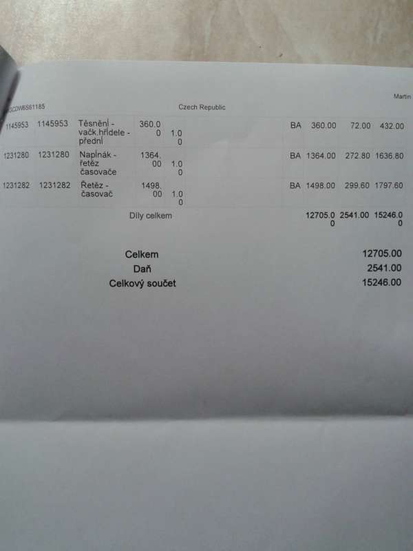 Zaclo to po par tisicich. Takove zvlastni seveleni v motoru. Idealne kolem 1500 rpm. Tusil jsem prusvih, vzal jsem do servisu a tam zjistili, ze je povoleny Retez casovac. OK, retez nemuze byt tak drahy rikal jsem si. Nicmene pan me vyvedl z omylu - dodrzuji standardizovany postup (rozumej nejdrazsi) a ten vyjde na 15.000 dily a 10.000 prace. Celkem 25k Kc (nabidku na dily prikladam, je to cena bez prace).