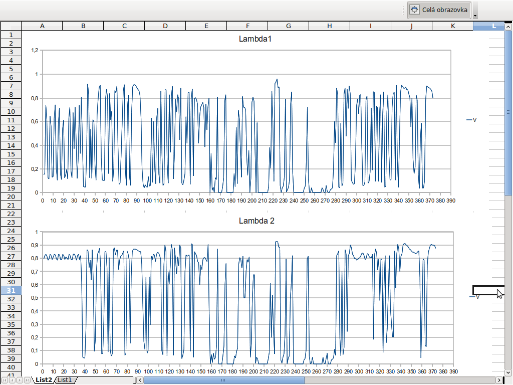 Dále jsem naměřil hodnoty z lambda sond a vypadá to, že jsou asi funkční. Jen mě zaráží, že od druhé lambdy je po celou dobu hodnota krátkodobého přizpůsobení 99,6%. Není to divné - jak to ukazuje vám? Doufám že mě nečeká výměna katalyzátoru