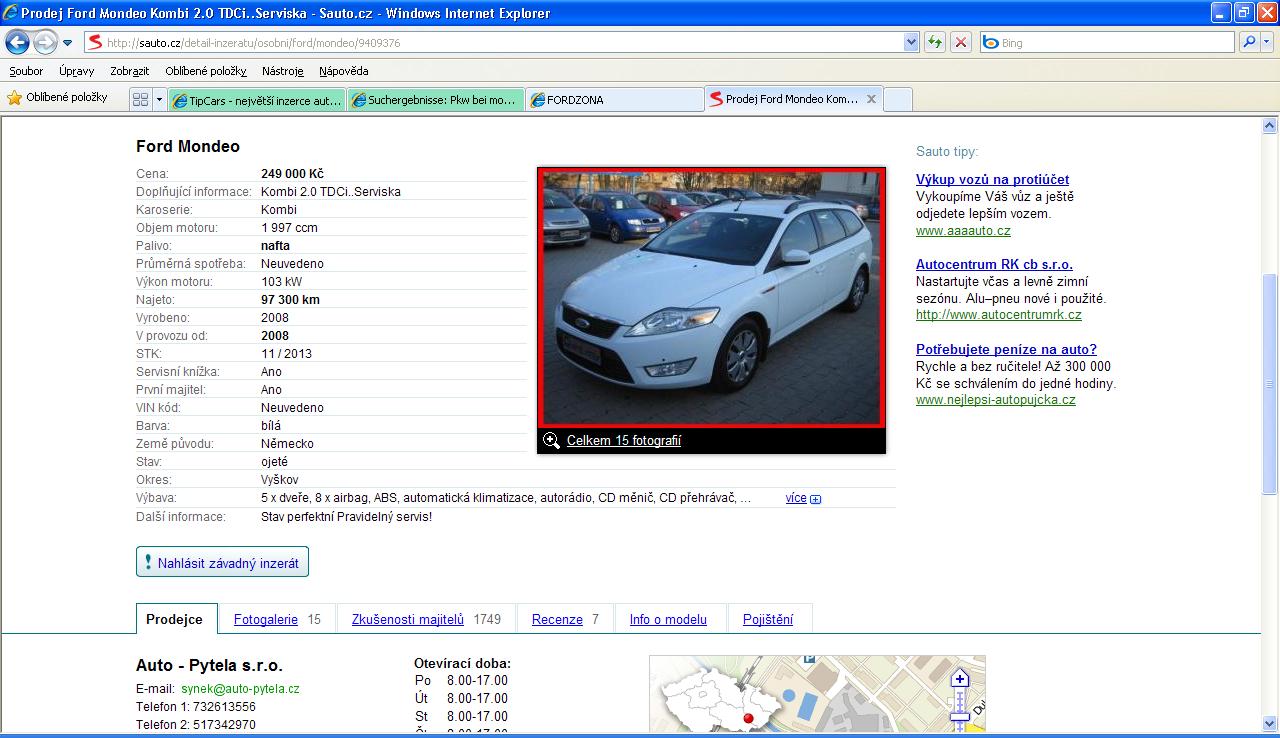 Zdravím přátelé, jsem se zadíval do Ford Mondeo a už nějaký čas brousím po netu jak českém tak i německém. Dneska jsem objevil jedno http://www.tipcars.com/#ford-mondeo/kom ... 00855.html ,ale nechci udělat chybu už jsem se jednou napálil. Proto bych chtěl slyšet i váš názor páč víc hlav víc ví