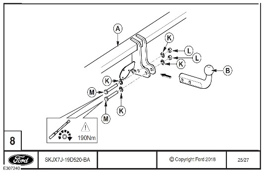 Kontrola upevňovacích dílů tažného zařízení (K, L, M na obrázku níže).