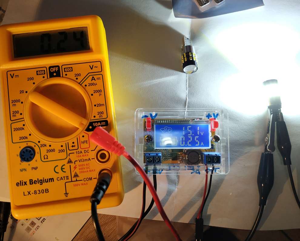 Levé světlo, fak z vrchu nic Pravé světlo, z vrchu docela OK. Obrysovka s lepší LEDkou v hliníkovém pouzdře. Je delší a nejenom se tam blbě dávala, ale asi je i slabě opřená. Dle mého to svítí skvěle a neoslňuje. Ale na DLR to asi nenahradí. Tyto silnější s NoCAN Error žerou při 15V asi 25mA. Měl jsem silnější hranaté, ale ty neprojdou otvorem. Už toto bylo max. .....