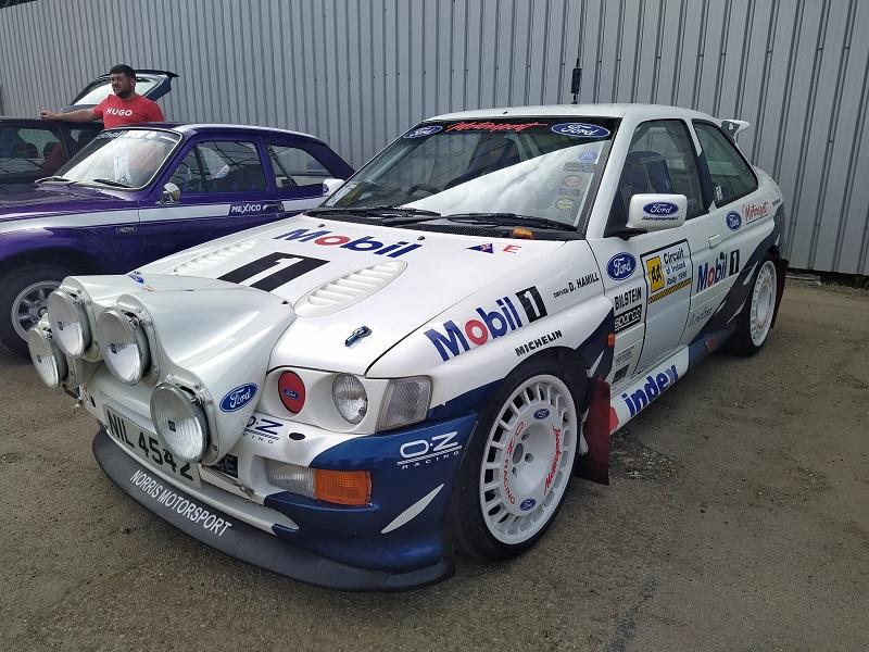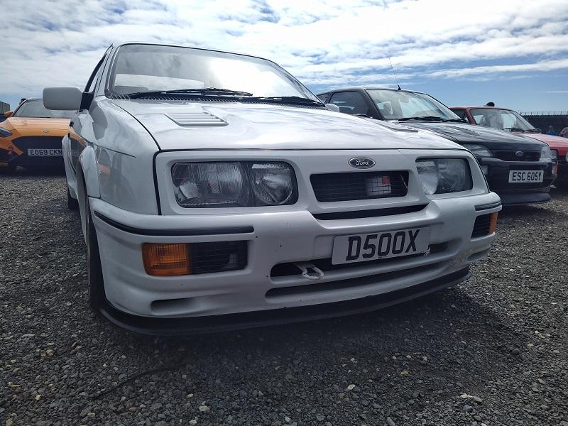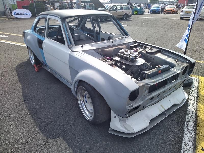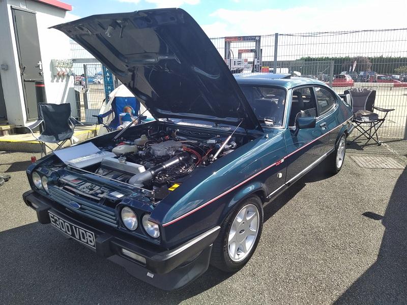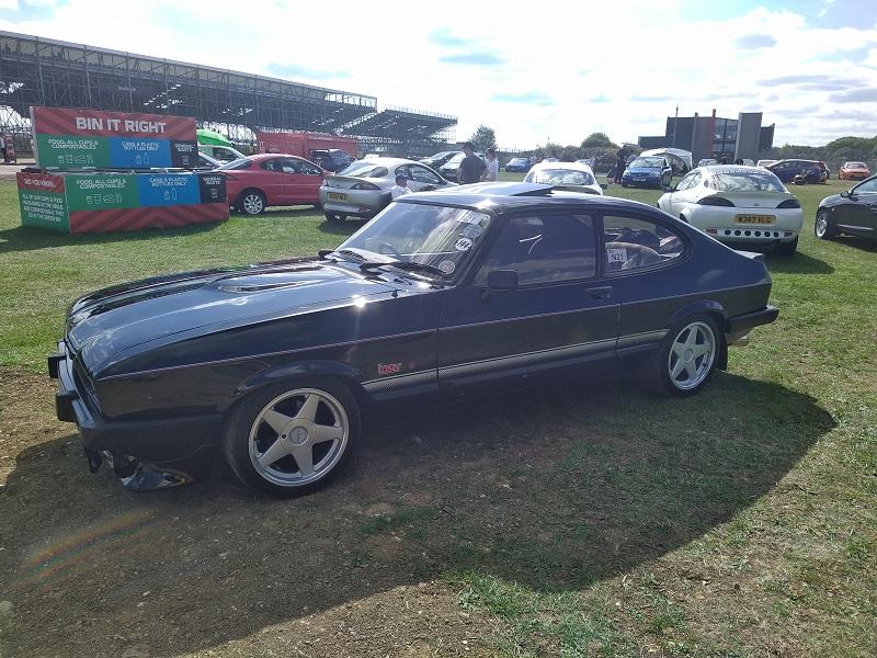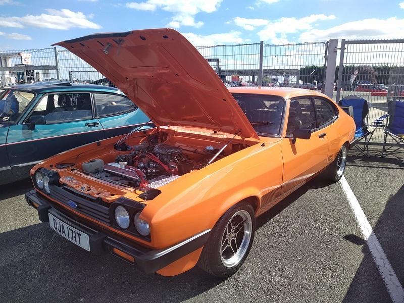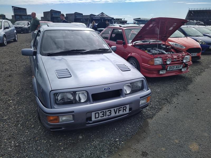 Už kousek od naší plochy, jsme viděli obrovské množství Fiest různých generací - je pravdou že ST180 je opravdu ve velkém počtu v anglii pořádně oblíbená a sekunduje jí její nástupkyně ST200. Samozřejmostí byly Focusy ST225 - také ve velkém počtu. Obecně, letos to byl ročník, kdy největší zastoupení co se počtu modelu týče, byla právě Fiesta. Procházíme kolem další tribuny a vystavované plochy. Hned z dálky do očí bijící - Escort RS Cosworth WRC tovární homologační speciál se "čtyřokem" na kapotě...Hned nám padla brada na začátek...o kus dál stojí první Ford Capri s krásným řadovým šestiválcem, vedle něj Cortiny poslední generace. Nevěděli jsme, kam dřív s očima - protože za auty byl plot a za ním dráha, takže chvíli jsme obdivovali stav a stáří aut a najednou hlavy nahoru a dívat se na ty zběsilosti na dráze...