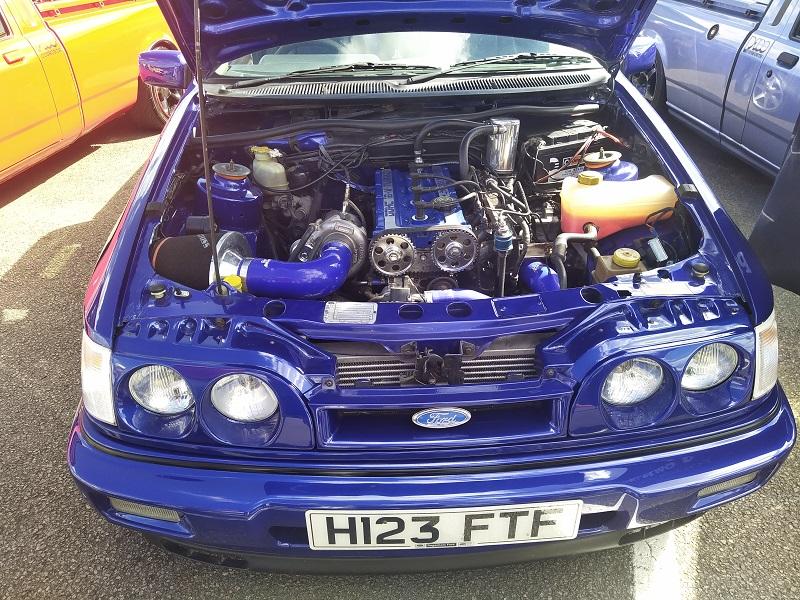 Chtělo se to vrátit nohama trošku zase na zem a myšlenkama zpátky do reality, jenže ono to vlastně moc ani nešlo. Ikdyž tam stojí něco v původním stavu a na oko to není žádná sporotvní verze, u nás to člověk s největší pravděpodobností neuvidí, a pokud ano, tak rozhodně ne v takovém stavu. Krásným příkladem dva vedle sebe stojící Escorty MK3 veverzi Courier, dvě krásné sériové Fiesty MK2, dvě naprosto krásné Anglie, nebo v řadě stojící 4 nádherné Fordy Capri. Chvíli jsme zase nevěděli, kam se dívat dřív, bylo tam toho tolik, že se to dalo těžko vstřebávat. Vedle stojících Capri stál z venku nádherný Ford Escort RS Cosworth - na první pohled sériový - tento moment dlouho nevydržel, když jsem viděl jak velké měl turbo, nezbývalo nic jiného, než nad tím zakroutit hlavou...Sotva tohle člověk rozdýchá, naproti stojí Escort MK1 kostička ve verzi kupé-kombi...Samo o sobě je tato verze velice vzácná, ale majitel zřejmě taky dobrodruh - motor Cosworth YB a auto na 13-ti palcových kolech s nízkoprofilovými pneumatikami. Jestli toho blouznění na slunci nebylo do té doby málo, tak kousek od těchto aut stály v řadě 4 Sierry ve verzi pickup....Dvě s pohonnou jednotkou V6 a dvě s jednotkou Cosworth YB...Už se začala pomalu dostavovat agónie z toho všeho kolem, ale ten hlavní " úpal " teprve přišel. Vrátím se nyní ke zmíněné Sieře, která byla na trati - ano, ten kombík na 17" plechových kolech, který střílel za každým kvaltem a udolal okruhový Escort RS Cosworth...Otevřená kapota mě vyloženě lákala, abych tam strčil hlavu a zjistil, co za peklo se tam schovává. Nijak zvláštní překvapení se nekonalo, protože už z jízdy na trati podle zvuku a projevu jsem věděl, že to bude určitě YB od Cosworthu, a samozřejmě, že bylo. Vedle motoru velké turbodmychadlo BorgWarner...Na bočním okýnku za řidičem byl na papíru celý rozpis úprav auta. Pokusím se fotku nahrát, protože to bylo hodně zajímavé čtení. Každopádně Sierra měla 651 koní , 525 Nm kroutící moment, sekvenční převodovku a mnoho dalších věcí. :irre: Rovnou mohu prohlásit, že mě to počtení docela odrovnalo a už jsem se nezmohl ani na to, kroutit nad tím hlavou - obvzlášť, když jsem viděl ty plechové disky, auto, ve kterém nebyl ani rám a korunou tomu všemu byl volant - obyčejný sériový volant z prvních modelů Sierry - takový ten, co má trojúhelníkový střed a jen dvě ramínka dole...V tu chvíli jsem přestal na chvíli mluvit a šel kam mě nohy nesly...