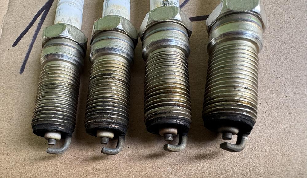 Asi po měsíci jsem vyměnil kabely (byli okousané od kun), dal jsem opět original Ford, změřil jsem odpory (vše OK). Po asi dalším měsíci jsem vyměnil cívku, dal jsem Bosch. Dále jsem změnil odtrh svíček na 1 mm a zkontroloval jejich zbarvení, všechny se mi zdají být stejné viz. foto níže. Problém beze změny přetrvává.