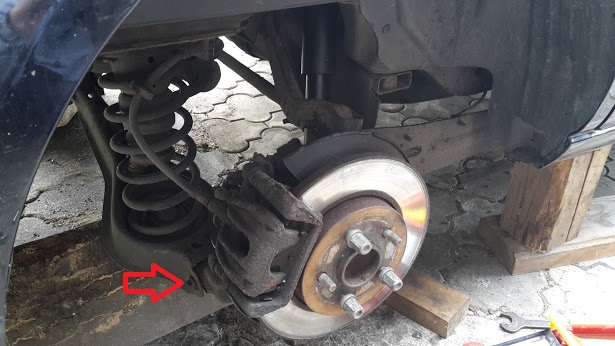 musíš to vzít silou... strč tam do té mezery rovný šroubovák a odpač to.. nějakej centimetr to na silenblokách povolí. Ještě bys mohl povolit tento šroub(viz šipka) potom by to mělo jít.. to už bude držet na jednom silentbloku a tlumiči...