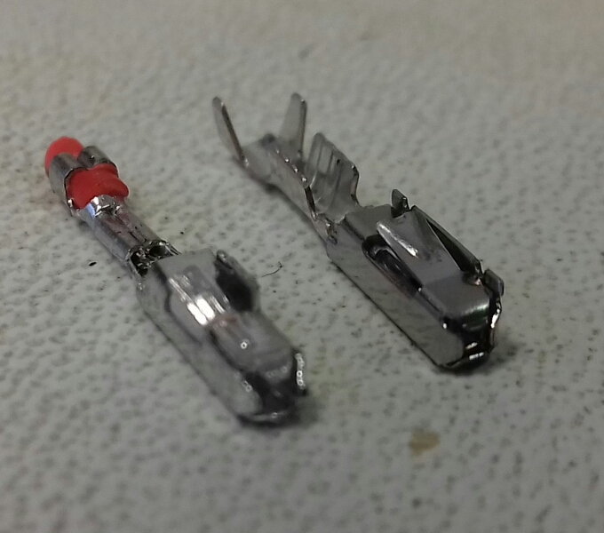 Kdyby se někomu s čínskými tlačítky (neřeže se taková díra a drží to na samořezné šroubky skrz pěnu) sporadicky objevovala chyba P1696 a tempomat nefungoval dokud se nevypne zapalování, doporučuji se zaměřit na piny na kabelech od tlačítek, které se přidávají ke konektoru do volantu. Pokud použijete i dodávány kabel od volantu k gemu tak i na tomhle kabelu. Ty piny stojí za prd a pokud už se je rozhodnete použít, je třeba je uvnitř napružit. Já to překrimpoval. (Vlevo původní Čína, vpravo nový TE)