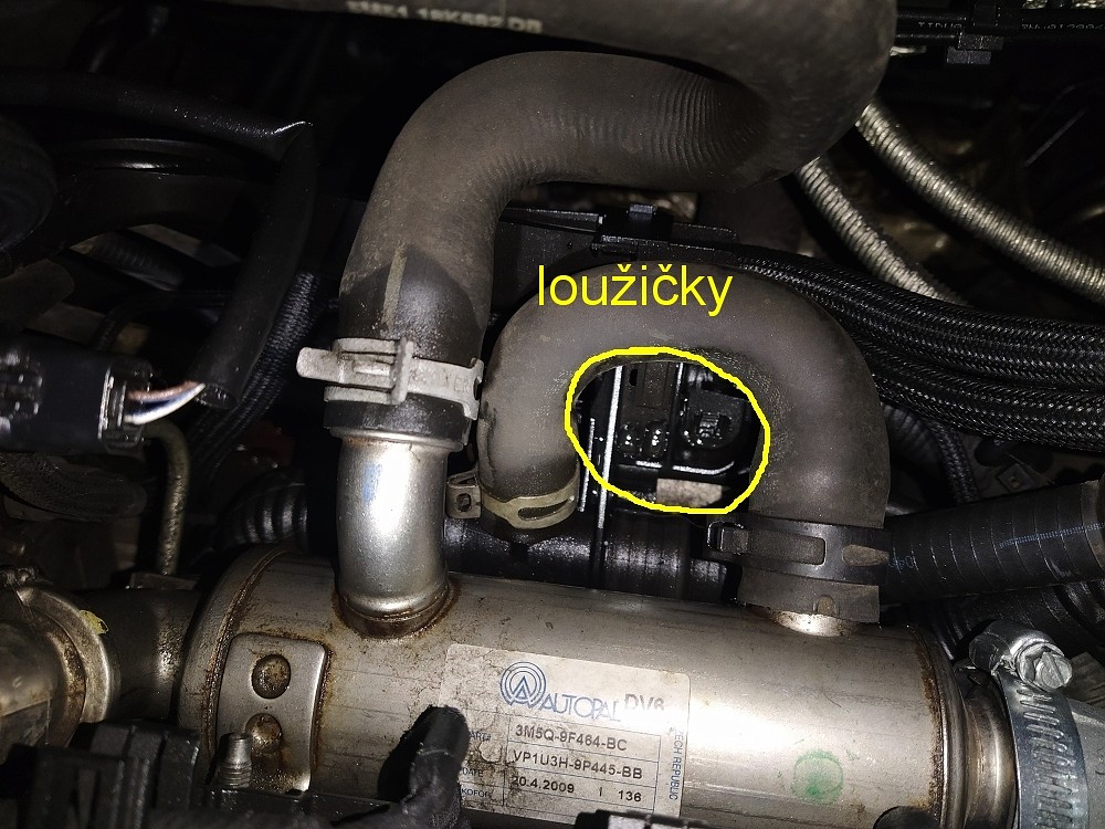 Jestli to nesmrdi naftou, ale je to spis jen mastne, tak to muze byt chl.kapalina. staci na spicku jazyka oliznout a jestli je to sladke, je to "fridex" Nejspis tece ten chladic vyfukovych plynu do EGRu - ten stribrny valec na fotce. Zkontrolovat taky hladinu v nadrzce, jestli neubyva voda