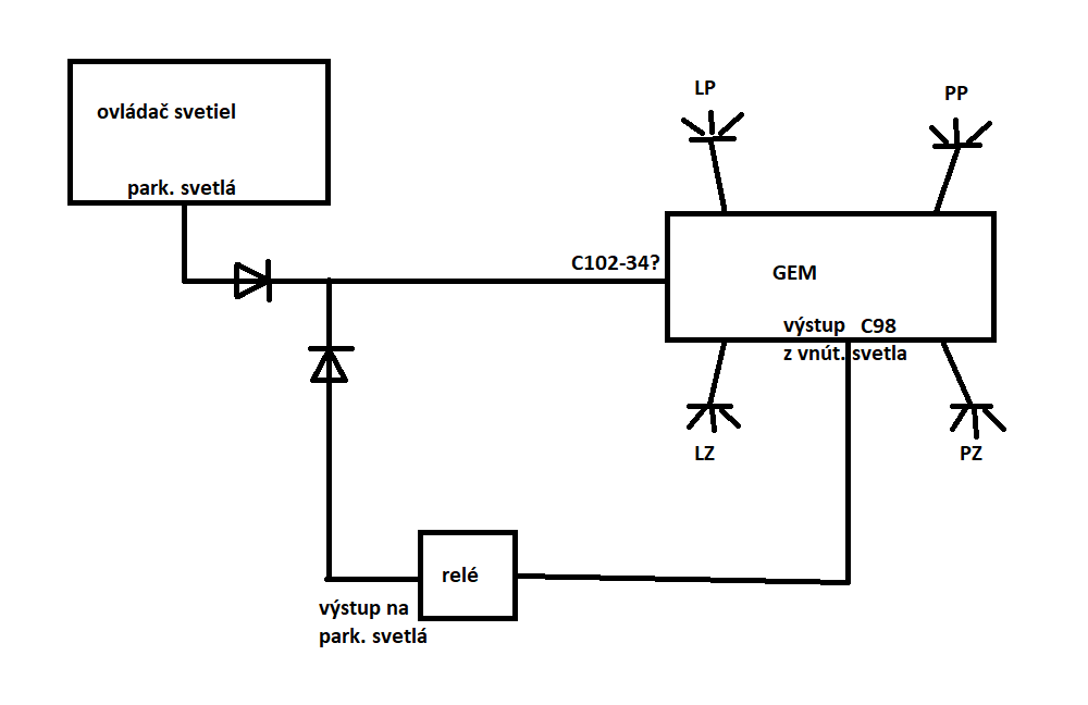 ZaQik, keby som chcel rozsvecovať parkovačky, mohol by som použiť nasledovné zapojenie? S tým, že nechcem prerušovať každý drát na svetlo, ale len jeden od vypínača svetiel: Prípadne dá sa to nejako zjednodušiť? Alebo chýba tam ešte niečo chýba? Chcem použiť SSR relé aby mi to necvakalo a chcel by som rozsvietiť predok aj zadok auta, nie len DRL. Rozsvecovanie skrz relé je len pre predstavu znázornené, viem že tam je viac drátov.ZaQik píše: 24.05.2017 05:16 pokud bys chtel rozsvecet predni i zadni obrysovky, tak bys musel prerusit 4 draty z GEMu (predni prava, predni leva, zadni prava a zadni leva), dat na ne diody a privest napeti pomoci rele (staci jedno) ... nevyhoda je, ze diody trocu snizuji napeti, takze obrysovky budou lehce min svitit a HLAVNE, jedna se o postupne stmivani, takze rele pri pohasinani bude hlucne cvakat (nutno ho poradne zabalit do izolace)