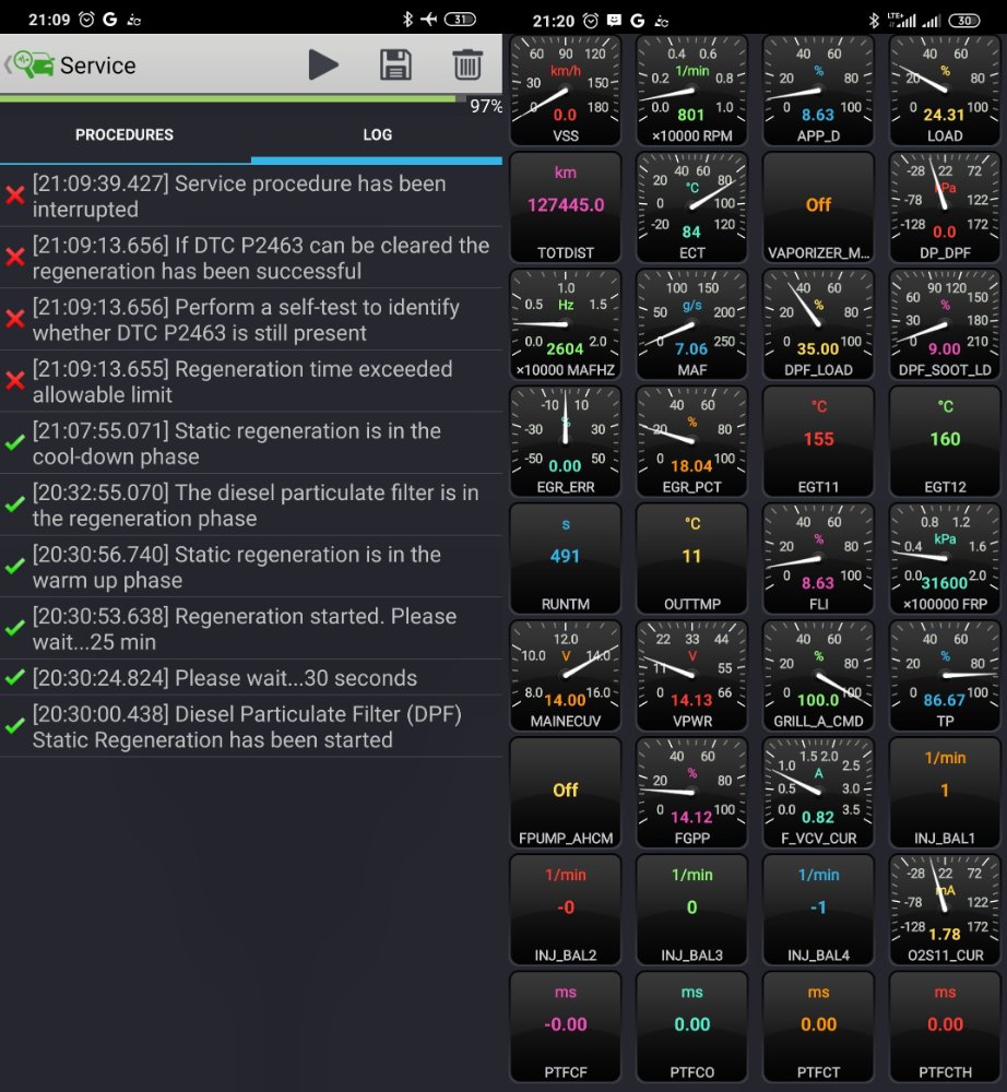 Tak bohužel mám problém a netuším jaký. Obávám se načatý DPF. Včera jsem na rady a po roce konečně dal statické vypalování. Konečně jsem jel sám, měl čas ( ikdyž ne těch 40 co to trvalo) a potkal prázdné parkoviště kamiónů. Vypalování skončilo chybou překročení času asi v 96%. Jako bonus jsem se ale z obvyklého 26% DPD_SOOT_LD dostal na krásných 9%. DPF LOAD 28% je také krásná hodnota, když většinou cca 38% časem po vypáklení a po vypnutí asi žhavení Vaporizéru (viz níže) kolem 50%. Chyba P2463 se zatím nikry nezobrazila.