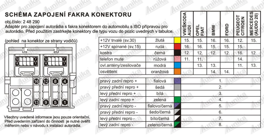 Máš na mysli v konektoru do rádia, viz schéma (neber prosím v potaz označení barev - to je kvůli zapojení toho BT)? Můžu tě prosím požádat o nějaký blbuvzdornější navedení? Tohle bych zkusil jako první, až pak bych zkusil jiné rádioZaQik píše: 05.08.2021 08:55 zadni a predni repraky na jedne strane maji kazdy svuj vystup, takze muzes prehodit draty v konektoru radia (nebo zkusit jine radio), at vis, jestli je spatne radio nebo draty k reprakum