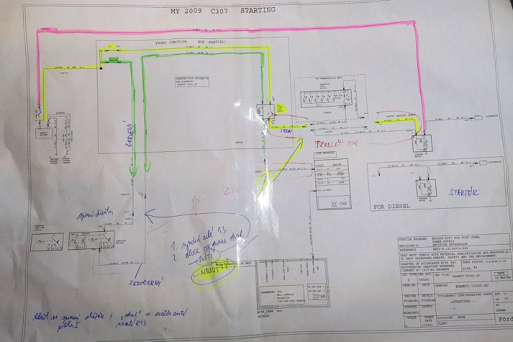Takže jsem vytvořil všechny možnosti přivedění napětí na kabely, které mají co do činění se startováním až na jejich konec a vždy existovala situace, kdy světla nesvítila. Kdyby tam byl můstek, musel se projevit. Navíc, kde by to bylo prošlehlý tak, aby svítila obě světla? A ještě by se možná startovalo otočením zapnutí světel, což se neděje. Takže do rozsvěcení světel nějak "kecá" ŘJ. To by bylo fajn.