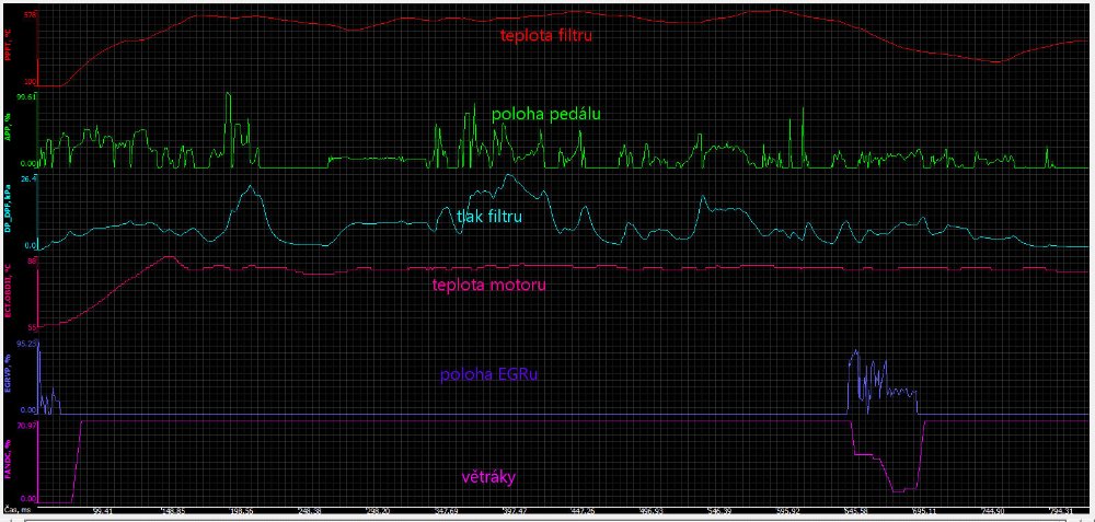 Naměřené hodnoty přikádám. Je tam postupně teplota filtru, rozdíl tlaků na filtru, poloha pedálu, otáčky, rychlost a další. Na druhém snímku jsou ještě otáčky (v procentech) sahary.