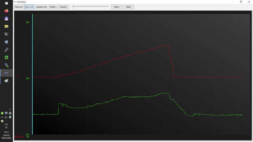 Na FordDiag je vidět jak klapka vyletí a překmitne při první změně hodnoty pedálu.