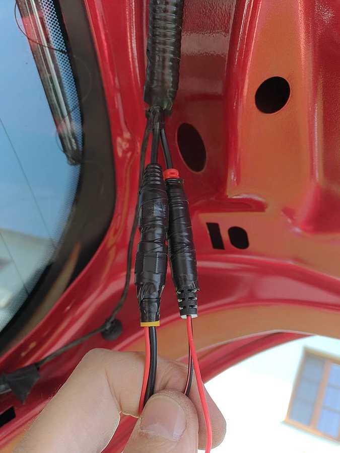 - já jsem při té příležitosti zjistil, že krajní konzole na liště jsou v horní části odlomené, tak jsem použil tmel na motory, který by mi jinak zaschnul: - protože dneska byl hic, podařilo se protáhnout konektory i spojka tou malou gumovou záslepkou (záslepka je velká, ale dírka malá), aniž bych ji roztrhnul. Nejdřívě šel větší (žlutý cinch), pak menší (červený napájecí) a nakonec spojka: - konektory jsem zaizoloval, aby se mi samovolně nerozpojily: - protože mi pájení moc nejde, používám takovéto spojky, které jen zatavím horkovzdušnou pistolí: - kostru jsem nikde netahal, protože páté dveře ukostřené jsou. Takže takto: - zvolil jsem levou stranu pro protažení kabelu (v zásadě je jedno, jestli zvolíš levou, nebo pravou stranu auta pro protažení) - pokud to šlo, nevycvakával jsem plasty za každou cenu, takže zde jsem stropnici jen poodhrnul a pomohl si háčkem - povolil jsem dva šrouby na levé straně kufru platu u světla interiéru a malinkato povycvaknul. Pak šel kabel prostrčit. - z LZ místa spolujezdce jsem prostrčil vázací drát s očkem kolem světýlka a protáhnul kabel do kabiny