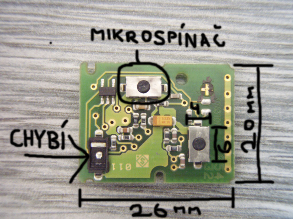 Tak už to mám opravené.Našel jsem jednu prodejnu ve Zlíně,tam měli podobný mikrospínač.Koupil jsem rovnou tři.Poslali mě o kousek dál do servisu elektroniky a tam mě to jeden borec přiletoval.Mikrospínač stál 10kč a práce 50kč.A to mě v autoservisech říkali,že to nespraví a musím si koupit nový klíč za cca 2000kč.Funguje to tak jak má.