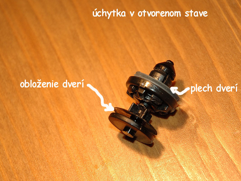 ty uchyty nech na čalounění a nacvakni je do otvorů na dveřích ,budeš muset použít trochu násilí nejlépe zabušit pěstí ale musí být dobře nasazené jinak je rozlomíš :!:
