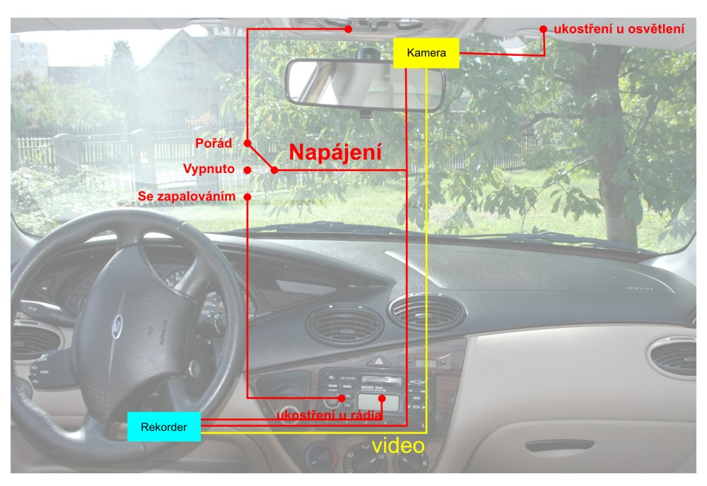 ad 3: Ke kameře je to kousek a do přihrádky před řidičem to povedu spolu s video kabelem. Tam vyřeším nějakou koncovku, na kterou se to záznamové zařízení připojí.