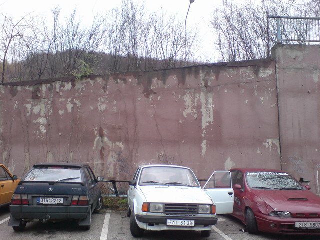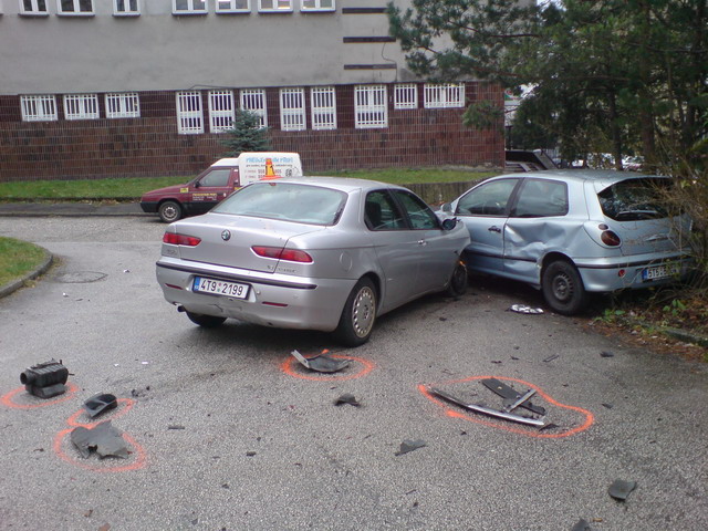 Stříbrná Alfa jedoucí směrem nahoru "v esíčku" nabourala červenou Fabii jedoucí dolů. Od ní se odrazila, přejela obrubník, sestřelila asi 15-20m zábradlí a skočila dolů cca 6m částečně na Kubovu Bravu a částečně na bílou 120tku. Pak ještě nabořila do dalšího auta. Takže to máme skore 4:0 a navíc padající plot poškodil dalších několik aut zaparkovaných v řadě pod zdí... Řidičce ani spolujezdci Jumping-Alfy se nic nestalo, Policie provedla dechovou zkoušku - údajně nebyla pod vlivem...