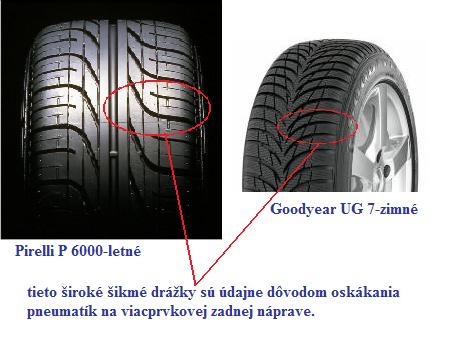 skúšal som zisťovať ďalej ako to je s oskákaním a dôvodom sú vraj široké odvodňovacie drážky smerujúce od stredu na hranu niektorých pneumatík. Tieto drážky sa používajú prevažne na smerových pneumatikách preto zjednodušene povedané "smerová sa oskáče", pravdou však je to čo písal žirafák že sa to stane aj na asymetrickej ak má taký typ šikmých drážok na hrane pneu.