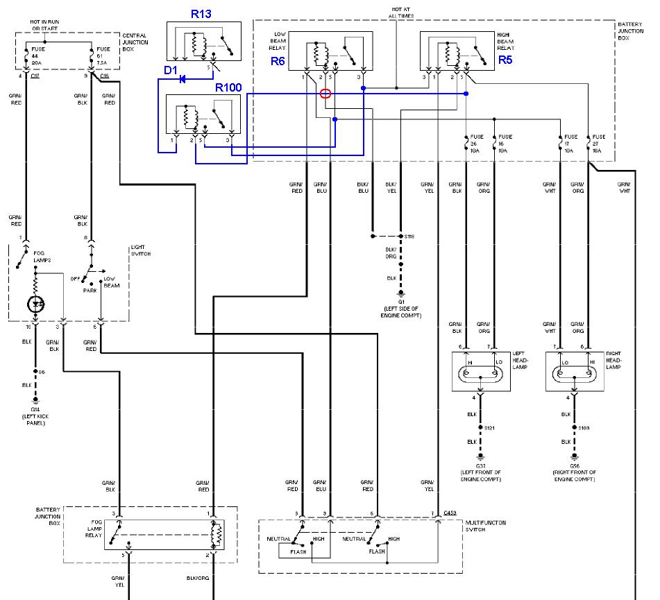 Relé R13 sepne, když běží motor, tak jsem z jeho pinu č. 5 připojil drát přes diodu na cívku dalšího relé - na obrázku jsem ho označil R100. Je to běžné autorelé, piny mají vlastně jiné číslování, ale to je jedno. Druhý pól cívky jsem připojil na pin 5 relé pro dálková světla R5 - u focusu před faceliftem to zajistí přepínání mezi dálkovými a potkávacími světly, tj. aby nesvítily obě vlákna žárovky H4. Pokud máte auto po faceliftu (kde při rozsvícených dálkových svítí obě žárovky, tj. potkávací H7 i dálková H1), připojte druhý pól místo na R5 rovnou na GND, tj. např. na pin 2 relé R6 (naznačeno červeným kroužkem). Pak vlastně můžete vynechat i diodu D1 (tj. zapojit jen drát, ne abyste vynechali celý spoj).