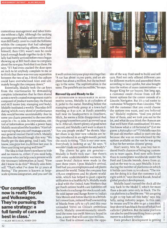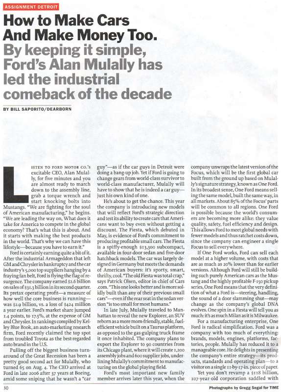 V posledním čisle časopisu Time (September 6, 2010) je zajímavý článek o Mulallym a Fordu (majitelé Fiest to raději nečtěte).