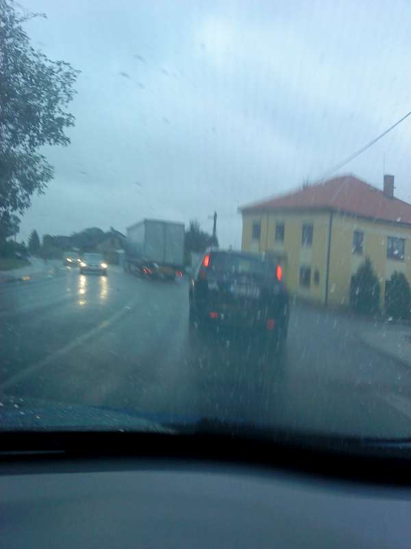 Odhaduju novější Focus a navigace na předním skle, barva na tmavá šedá až modrá, v tom počasí se blbě odhadovalo a na zadních dveřích šedivá samolepka motorky s nápisem Bandit.