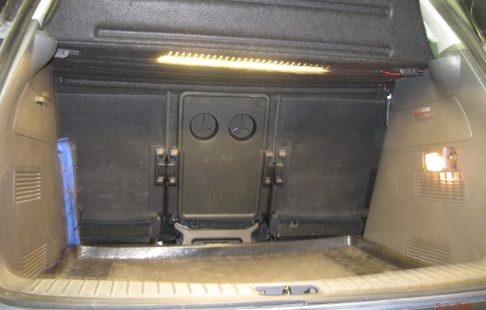 Zality LED pasek 45cm jsem zespoda prilepil na "roletku". C-max nema roletku, ale to neva. Moc se mi do lepeni nechtelo, protoze uz bude obtizne pripadne zmenit pozici (lepi se to na chlupaty povrch), ale "prisiti" se nepovedlo, protoze material krytu kufru je moc tvrdy a neslo to propichnout ani pomoci klesti. Nerad totiz neco pridavam do auta, aniz by se to dalo odstranit beze stop. Kvuli obcasnemi sundavani krytu jsem pouzil konektor na pripojeni ventilatoru na MB v PC. Do oblozeni kufru jsem diru nevrtal a jen jsem to protahl do prave schranky a odtud k orig. svetlu. Tam jsem oholil vodice a pripajel kablik k LCD pasku.
