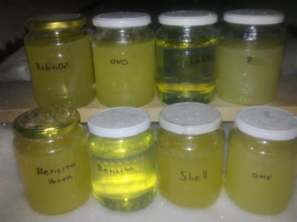 Nej byla AGIP arctic, OMV arctic a benzina TOP Q (bez jakyho koli zakalu), zbytek zakaleny do mlecne zluta, ale vse OK, jelikoz kristaly parafinu byly rozptyleny po cele plose, kdyby pry sedli na dno, bylo by to spatne. Pak tam meli jeden vzorek "letni" nafty a ted mel usazeny parafiny na dne, pridali do nej VIF v dvojnasobnem mnozstvi a nechali dalsi noc venku a uz to bylo lepsi - vse rozptyleno