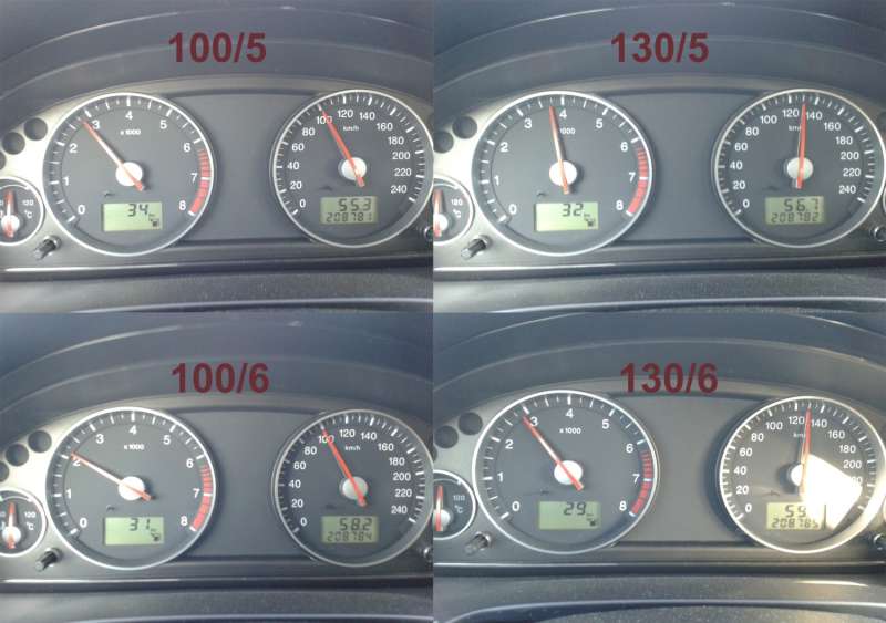 ). Jak je vidět, tak 100 km/h znamneá lehounce pod 2500 ot. a 130 km/h nějakejch 3300 ot. (a ne 3000 jak jsem si myslel)