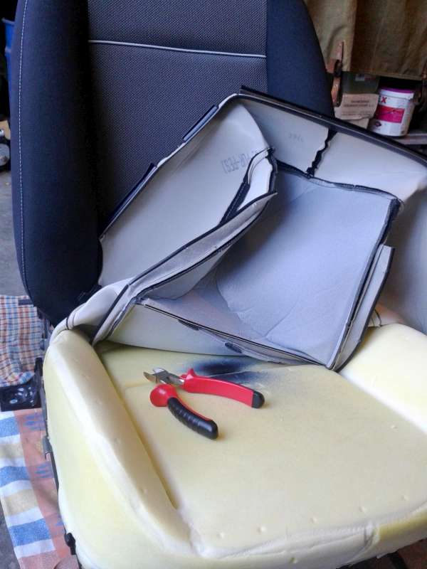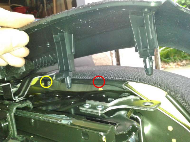 1) Vyndáme sedadlo z auta a uděláme si dostatek prostoru (nedokážu si představit dělat vše bez vymontování sedadel z auta, předevsím sundavání plastů). 2) Na těchto místech jsou 3 úchyty, které drží plast (na druhé, snažší straně, jsou pouze 2). Kolečko pro sklon sedadla silou k sobě vysuneme. 3) Zde jsou vidět úchyty. Červěně jsou označeny místa kde drží potah sedadla. Ten se musí silou vycvaknout. Žlutě je označený držák potahu se kterým je největší problém (na každé straně 2). Jde opravdu špatně vycvaknout a nejspíš ho pří demontáži poškodíte (nikaj to ovšem nevadí výsledné práci, není nic poznat) 4) Vycvaknutí potahu zespodu sedadla (provádí se asi na 3 místech) 5) Sundavání potahu 6) Potah je přidělaný k sedadlu kovovými kroužky. Zde se nebojte použít štípačky a kroužky přecvaknout (jinak to opravdu nejde, pokud u toho nechcete strávit týden) 7) Přestřihat stačí jen jedna strana a střed (pod zbytek už potah zasuneme rukou)