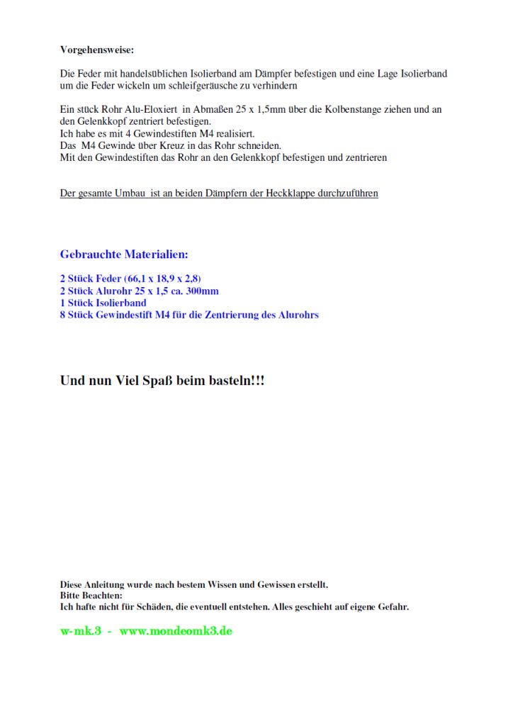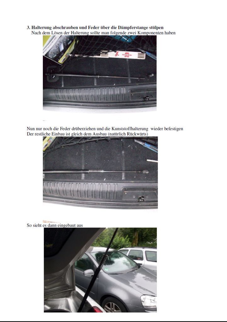 Kdyby měly o podložku (cca.3mm) víc, jistě by fungovaly dobře. Jinak zavírání kufru je o poznání namáhavější, musí se s tím víc třísknout. Ale pro ženu je možná víc namáhavé kufr otevřít nežli takto zavřít. Samotná instalace je velmi jednoduchá, složité je jen přijít na to jaké přesně pružiny a kolik podložek je potřeba, což jsme absolvovali my s tátou