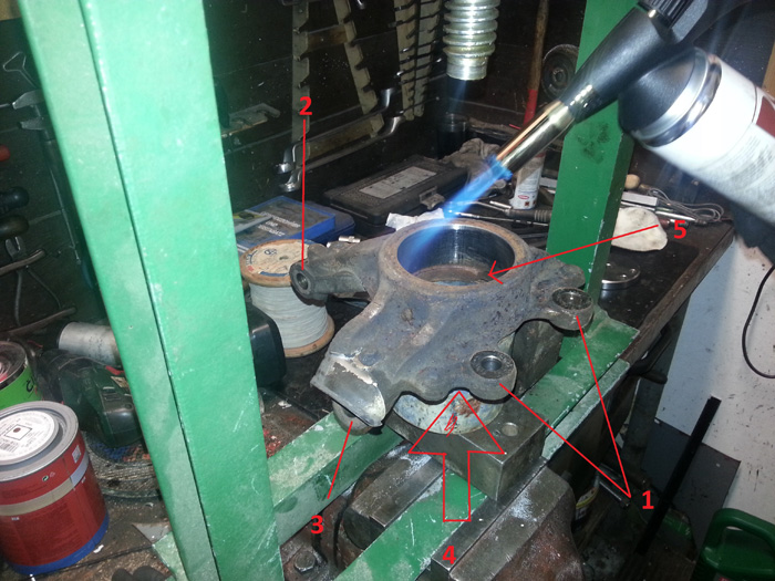 7.Nyní musíte vymlátit ven ložisko. Dáte na svěrák nahřejete hořákem (hodně) těhlici a vymlátíte ložisko ven palicí. Je to brutální práce. Pozor ať neuděláte z těhlice šišoid.