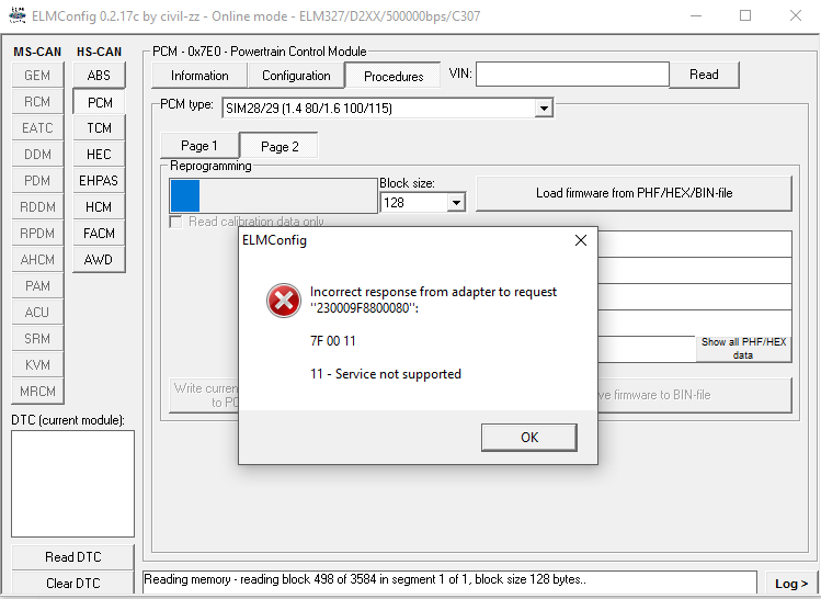 Mam tento kabel, ostatne veci cita a zapisuje v pohode, ale v PCM pri citani fw vyhodi tento error - Service not supported. Niekedy v polovicke, niekedy hned na zaciatku. Pri spustani ELMconfig som skusil oba drivre, pri oboch vysledok rovnaky. Rychlost som mal vzdy na Auto. dik
