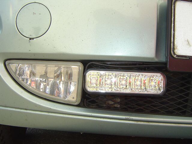 Tak, nafoceno (ale žádná sláva, mám takový historický foťák). Svítí to opravdu skvěle, jen je potřeba je natočit malinko nahoru, aby byly dobře vidět i z nákladních vozidel. Automatika je rozsvěcí nikoliv při zapnutí zapalování, ale až při startu vozidla, zhasnutí je několik vteřin po vypnutí motoru. Neničí se tak drahé žárovky v hlavních světlometech a displej rádia svítí pořádně a ne napůl