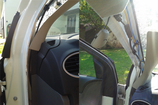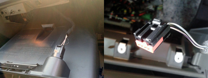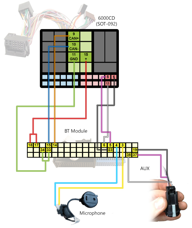 6) Z původního konektoru z rádia vycvakneme spodní konektory. Bílý konektor slouží pro AUX, ten je třeba ustřihnout a dle schématu propojit s BT modulem. (5,6 a 23 na schématu.) 7) Konektor AUX který vede do přihrádky spolujezdce je také potřeba ustřihnout a připojit k BT modulu. (19, 37 a 38 na schématu) 8 ) SOT-092 redukci propojíme s konektorem od autorádia, zapojíme do ní oba spodní konektory (které byly původně v originálním rádio konektoru). Kabeláž můžeme oblepit textilní izolační páskou pro zamezení otřesů. 9) Natáhneme mikrofon skrze rádiový prostor, dále za volantem až ke dveřím, kde ho prostrčíme mezi plasty do mezery za tesněním u dveří (černé gumové tesnění dveří pouze vycvakneme). 10) Kabel vedeme za tesněním (jsou zde gumové packy pro přichycení kabeláže). A-sloupek není třeba ani demontovat, pokud jsme šikovní