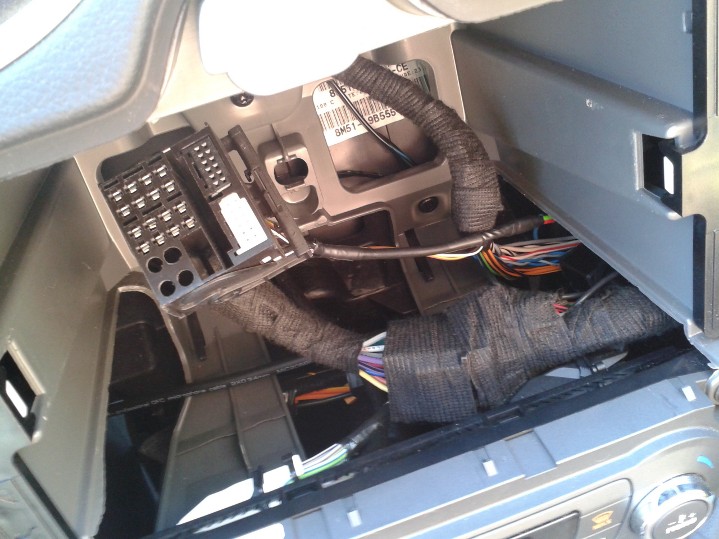 2) Seženeme si BT Modul (investice cca 500 Kč) s 54pin konektorem, mikrofon na A-sloupek (originál má finis 1363462), držák modulu + šroub (nově Ford dodává náhradu držáku pod finishem 1353218, šroub 1231391), cca 3 metry mikrofonového kabelu a několik metrů 1mm kabelu (případně několik samořezných rychlospojek, izolační pásku apod..) 3) Kabeláž propojíme viz obrázek. Vznikne 4) Demontujeme rádio a skřínku u spolujezdce viz. návod