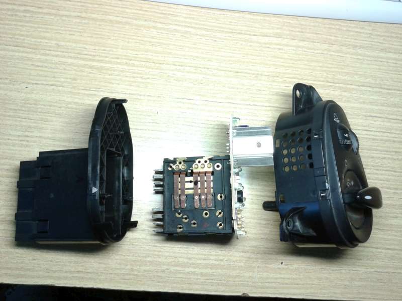 Zhasínala mi a potom úplně přestala svítit palubovka a podsvícení ovladačů, svítil pouze displej kilometrovníku. Očištění kontaktů lihem nepomohlo, tak jsem je poškrábal jehlovým pilníkem a už to funguje, poškrábal jsem oba kontakty proti sobě. Moc ten plechový kontakt nevyhýbejte, jinak se vám bude těžko vracet. Mám vypínač včetně mlhovek, naklápění světel a nastavení intenzity osvětlení palubovky. Pokud od sebe odděláte i čelní plast s otočným vypínačem, tak v rozdělaném stavu netočte s ovládáním naklápění světel a intenzitou podsvícení. Posílám fotku s označeným kontaktem pro podsvícení palubovky.