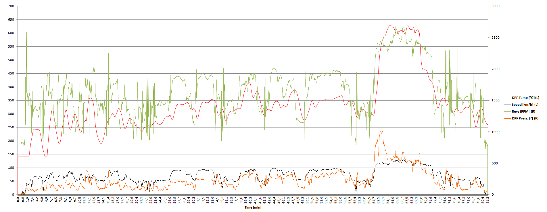 pre nazornost ako sa daju namerane udaje spracovat pripajam graf z cesty MY_BA cca 100km kde som si vybral pre mna zaujimave hodnoty teplota a tlak DPF a k tomu rychlost auta z toho viem presne urcit kde som pocas uvedenej trate ktoru robim kazdy vikend a su tam este otacky motora - asi najmenej zaujimave, tuto vidiet ako sa spustila regeneracia pri vjazde na dialnicu v Malackach a teplota jemne prekrocila 600, pri regene v meste dosahuje len 500, teraz chcem este merat ci sa podari pri regeneracii pri nizsej rychlosti zvysit teplotu a teda ucinnost regeny zvysenim otacok-podradenim, predpokladam ze ano, uvidim...