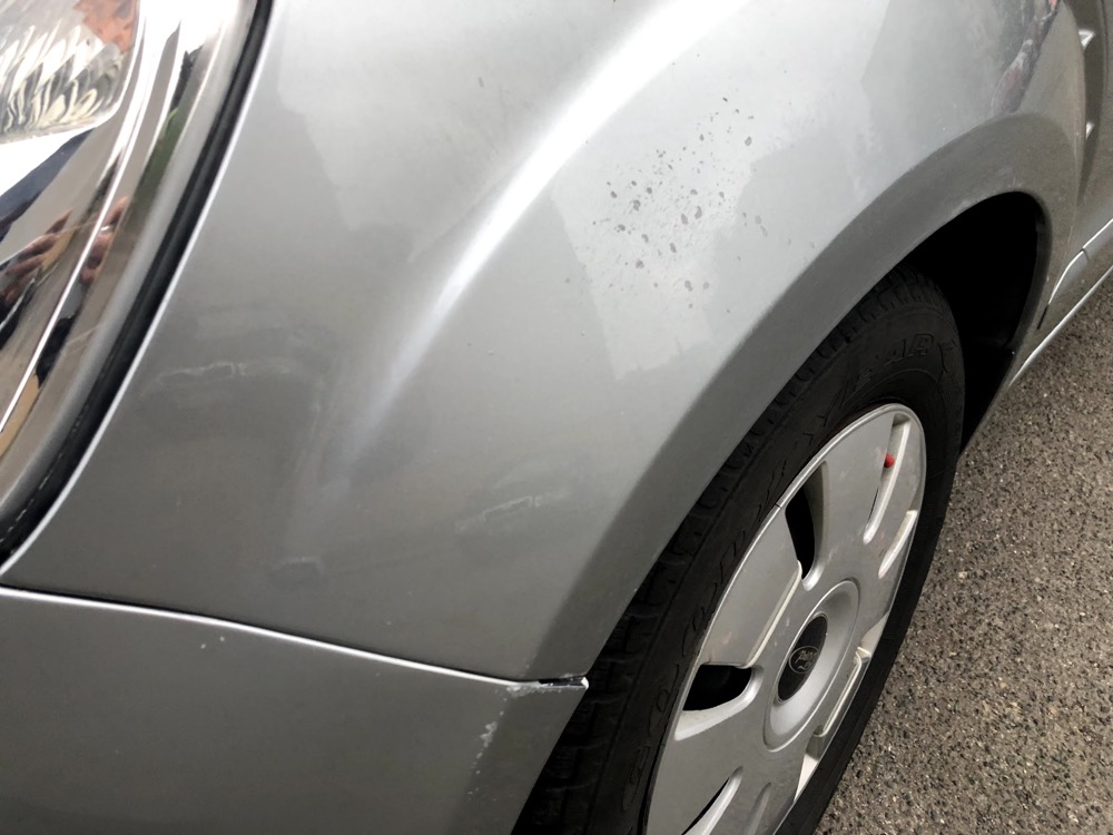 Vedle zaparkovanému autu se asi nedařilo vyhrabat ze závěje a můj narazník a blatník dostal kanonádu kamínků.
